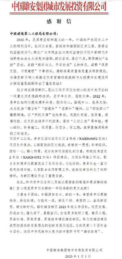 近日,公司收到來自中國雄安集團城市發展投資有限公司的感謝信。感謝信對公司雄安容東2#地項目在2022年克服時間緊、任務重、疫情防控諸多不利因素,精心組織、科學施工,保質量、保安全、保工期,高標準高質量推進重點項目建設中發揮的標桿示范作用表示高度認可和肯定。