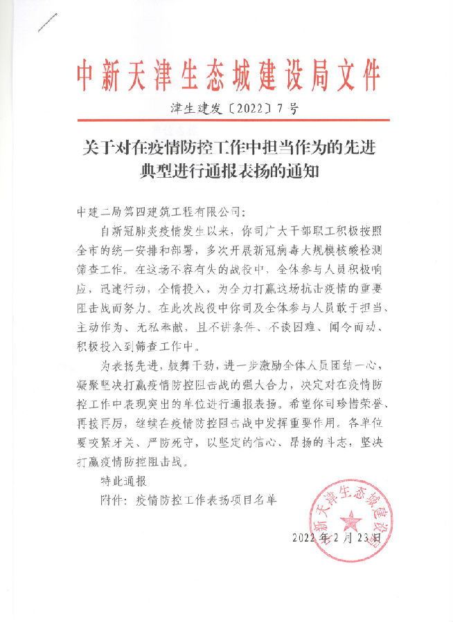 近日,公司收到來自中新天津生態(tài)城建設(shè)局的文件。文件對公司天津貽成學(xué)府項目在疫情防控工作中主動擔(dān)當(dāng)作為的突出表現(xiàn)給予肯定。