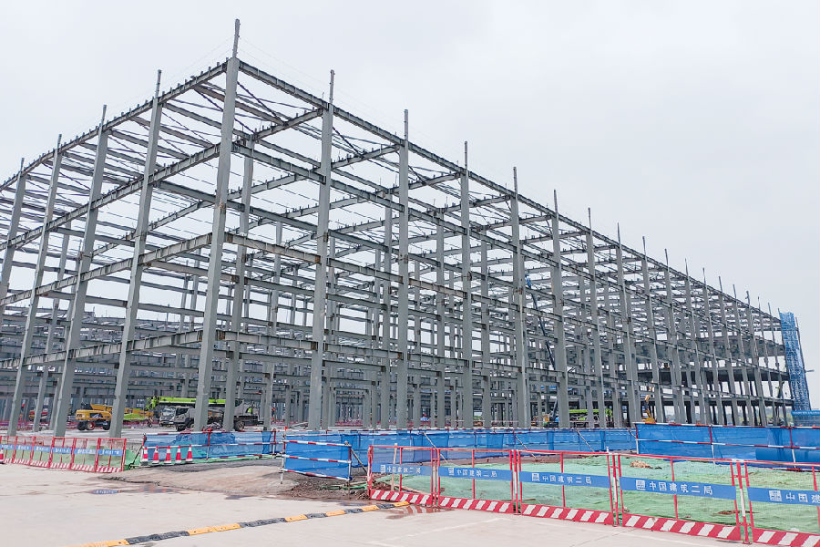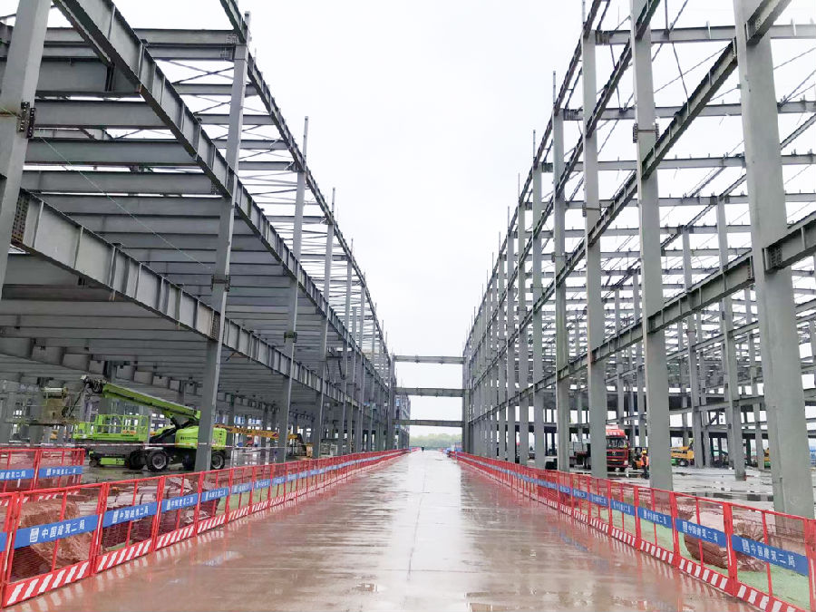 高效穿插:項目在開工初期,第一時間制定了主體結(jié)構(gòu)、鋼結(jié)構(gòu)、外圍護及地坪、市政工程等多作業(yè)面流水穿插施工方案。市政過路管線提前預(yù)埋,通過正式路、臨時路之間的轉(zhuǎn)換,以永臨結(jié)合的方式實現(xiàn)市政工程穿插施工。主體施工階段合理劃分施工段,進行分段流水施工,主體拆模后及時插入二次結(jié)構(gòu)施工。鋼結(jié)構(gòu)施工與結(jié)構(gòu)地坪穿插施工,預(yù)留吊車行走通道。外圍護與地坪分段流水作業(yè),實現(xiàn)相互穿插,互不影響。